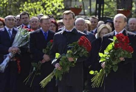 4月23日,俄羅斯總統(tǒng)普京、當(dāng)選總統(tǒng)梅德韋杰夫,以及葉利欽家人出席俄前總統(tǒng)葉利欽墓碑落成儀式。(國際在線圖)