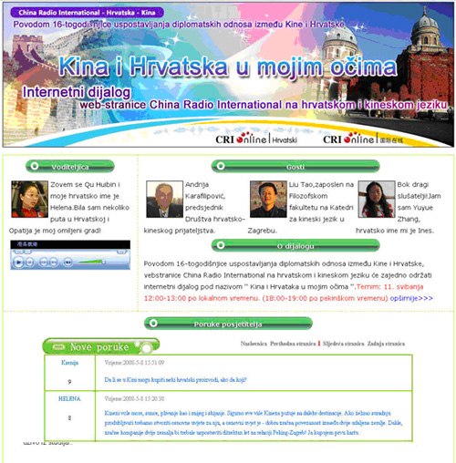 國際在線消息:國際在線中文網和克羅地亞語網將于北京時間5月11日18:00至19:00聯合推出主題為“相距不再遙遠——我眼中的中國和克羅地亞”網絡對話,這是國內首次在中克兩國間采用網絡方式進行的音頻圖文直播模式的訪談。