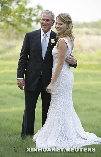 這張5月11日由白宮發布的照片顯示的是,5月10日,美國總統布什和女兒詹娜在婚禮前合影。10日傍晚,布什總統的愛女詹娜在美國得克薩斯州克勞福德農場舉行露天婚禮,與交往已久的男友黑格共結連理。 新華社/路透