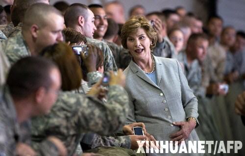 6月8日,在阿富汗巴格拉姆美軍基地,美國第一夫人勞拉·布什(中)與美軍士兵見面。布什夫人當日突訪阿富汗,呼吁國際社會不要放棄這個飽受戰爭、暴力摧殘的國家。 新華社/法新