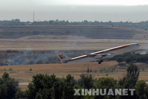 8月20日,一架伊比利亞航空公司飛機從西班牙馬德里機場的飛機失事現場附近飛過。當日下午,西班牙航空公司的一架客機在馬德里機場起飛時沖出跑道并起火。新華社記者陳海通攝