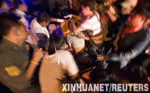 9月2日,在泰國首都曼谷,一名反政府示威者受傷后接受臨時治療。數千名支持政府和反政府示威者2日凌晨在首都曼谷發生大規模激烈沖突。泰國總理沙馬當日宣布曼谷地區進入緊急狀態。 新華社/路透 |