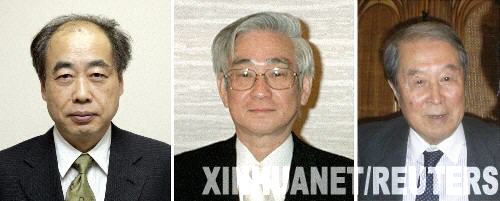 2008年10月7日 日美科學(xué)家分享2008年諾貝爾物理學(xué)獎 10月7日,瑞典皇家科學(xué)院在斯德哥爾摩宣布,美國籍科學(xué)家南部陽一郎和日本科學(xué)家小林誠、益川敏英獲得2008年諾貝爾物理學(xué)獎。這是小林誠(左)、益川敏英(中)和南部陽一郎的拼版照片。 新華社/路透