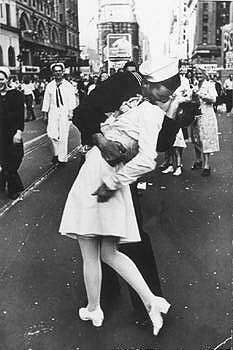 伊迪絲老太說,1945年8月15日,當日本宣布投降后,她和數以萬計的群眾涌到紐約街上,熱烈慶祝。當時群眾的情緒十分高漲,氣氛熱鬧。就在百老匯街和第45街的交界處,突然有一名水兵走上前攬 她的腰,與她深情接吻。整個過程被《生活》雜志攝記艾森施塔特拍下,成為一幅經典照片。