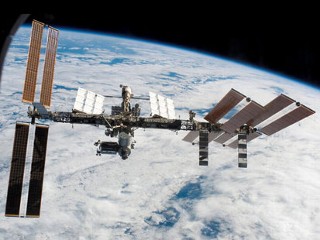 從“奮進(jìn)”號航天飛機(jī)上看到的國際空間站,空間站背后是蔚藍(lán)色的地球及黑色浩瀚的宇宙。