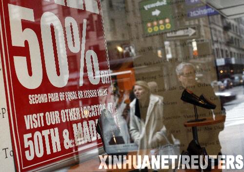 11月18日,美國紐約一家鞋店打出半價促銷的廣告。經濟危機的到來讓很多零售商家不得不以降價促銷的方式降低損失。 新華社/路透