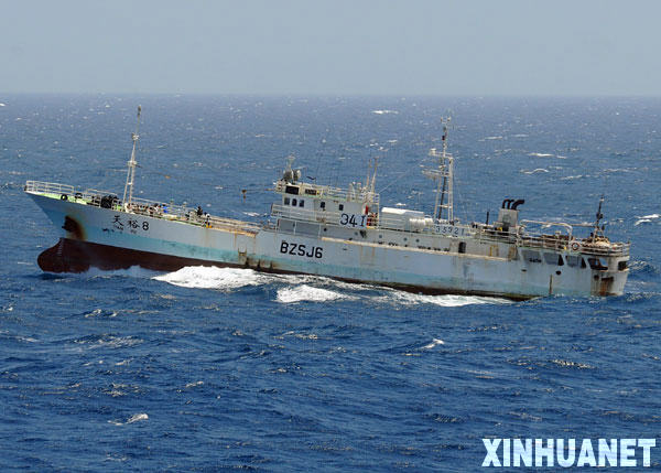 這張美國海軍公布的照片顯示,11月17日,海盜劫持著中國漁船“天裕8號”行駛在印度洋上。這艘天津市遠洋漁業公司所屬金槍釣漁船當地時間13日晚在肯尼亞沿海漁場正常作業時被劫持,船上有24名船員,其中中國籍船員16名,外籍船員8名。 新華社發