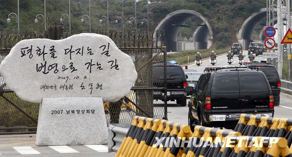 這是2007年10月3日韓國前總統盧武鉉的車隊穿過軍事分界線的資料照片。 11月12日,朝韓將軍級會談朝鮮代表團團長正式通知韓國軍方,將從12月1日起采取“重大的實際措施”,切斷經由朝鮮半島軍事分界線的所有陸路通道,嚴格限制通行。 新華社/法新