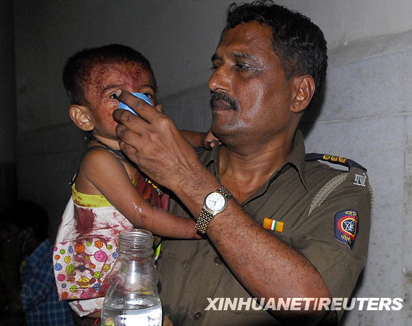 11月26日,一名警察在印度孟買一所醫(yī)院安撫一名在襲擊中受傷的兒童。新華社/路透