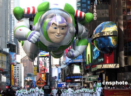 美國(guó)紐約第八十二屆感恩節(jié)大游行于11月27日在曼哈頓百老匯大道舉行,預(yù)計(jì)有300萬(wàn)當(dāng)?shù)鼐用窈陀^光客沿街觀看。圖為首次登場(chǎng)感恩節(jié)游行的動(dòng)畫片《玩具總動(dòng)員》中的卡通人物熱氣球走過(guò)時(shí)代廣場(chǎng)。 中新社發(fā) 鄧悅 攝