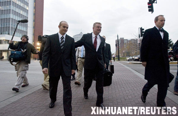 12月8日,前美國“黑水”私人保安公司雇員尼克·斯萊特(中左)和他的律師托馬斯·康諾利(中右)到達(dá)猶他州鹽湖城地方法院。美國司法部當(dāng)日說,因卷入去年伊拉克一起造成10多名平民死亡的槍擊事件,美國“黑水”私人保安公司5名雇員被控14項(xiàng)殺人罪名、20項(xiàng)殺人未遂罪名和一項(xiàng)濫用武器罪名。 新華社/路透
