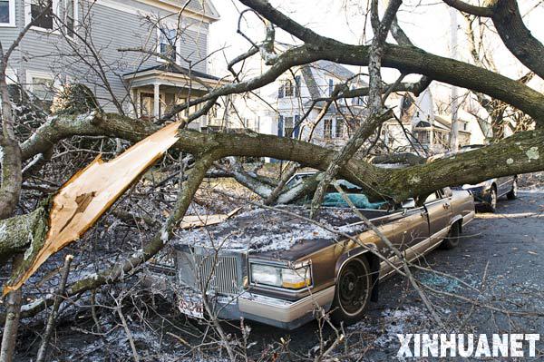 12月13日,在美國馬薩諸塞州伍斯特市,一輛汽車被在冰風暴中倒下的樹木砸毀。一場冰風暴12日登陸美國新英格蘭地區,造成包括馬薩諸塞州在內的大范圍電力供應中斷和道路交通受阻。美國總統布什13日宣布,遭遇嚴重冰風暴災害的馬薩諸塞州北部進入緊急狀態。 新華社發