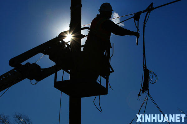 12月13日,在美國緬因州南波特蘭,一名電信公司工人搶修在冰風暴中損毀的電纜。一場冰風暴12日登陸美國新英格蘭地區,造成大范圍電力供應中斷和道路交通受阻。美國總統布什13日宣布,遭遇嚴重冰風暴災害的馬薩諸塞州北部進入緊急狀態。 新華社發