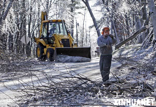 12月13日,在美國新罕布什爾州德里,一名男子在冰風暴過后清理散落在路中央的樹枝。一場冰風暴12日登陸美國新英格蘭地區,造成大范圍電力供應中斷和道路交通受阻。美國總統布什13日宣布,遭遇嚴重冰風暴災害的馬薩諸塞州北部進入緊急狀態。 新華社發