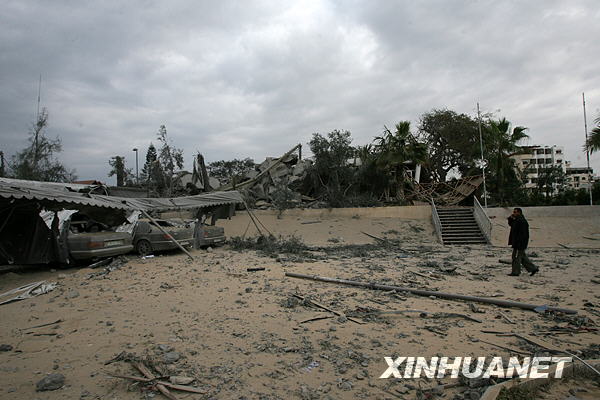 12月29日,一名哈馬斯安全人員在加沙地帶遭以色列空襲的現場檢查。新華社發