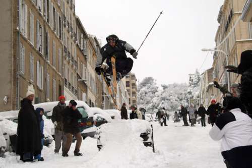 法國第二大城市馬賽7日降大雪,市民在城內練習滑雪。