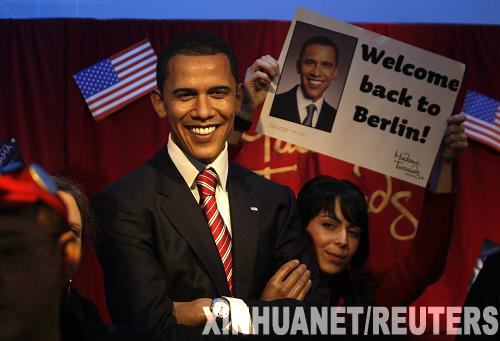 1月15日,在德國首都柏林的杜莎夫人蠟像館,一名參觀者高舉“歡迎回到柏林”的標(biāo)語牌與美國當(dāng)選總統(tǒng)奧巴馬的蠟像合影。當(dāng)天,柏林杜莎夫人蠟像館的這尊奧巴馬的蠟像首度與參觀者見面。新華社/路透