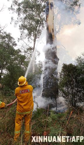 澳大利亞山林大火肆虐 2月8日,在澳大利亞維多利亞州首府墨爾本北部,消防員為仍在燃燒的大樹滅火。澳東南部正遭遇25年來最嚴(yán)重的山林大火。新華社/法新