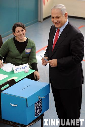 2月10日,以色列議會最大反對黨利庫德集團主席內塔尼亞胡(右)在耶路撒冷的一個投票站投票。新華社記者殷博古攝