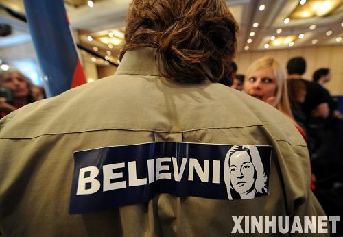 2月10日,在以色列特拉維夫,以色列外長、前進黨主席利夫尼的支持者身著印有她頭像的服裝參加慶祝活動。以色列媒體10日晚公布的出口民調結果顯示,中間派政黨前進黨在當晚結束的議會選舉中贏得最多席位,中右翼政黨利庫德集團位居第二。新華社記者殷博古攝