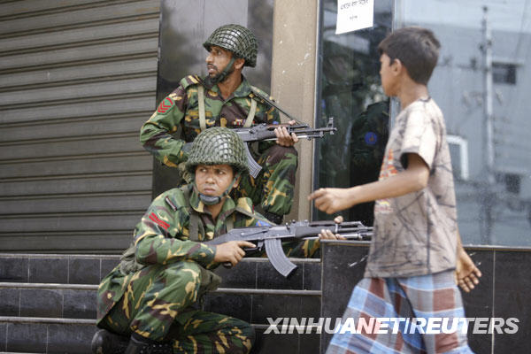2月25日,在孟加拉國首都達卡,士兵在“孟加拉國步槍隊”總部附近警戒。新華社/路透