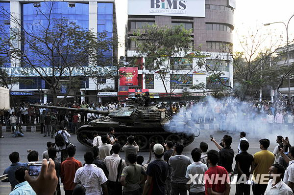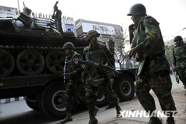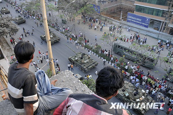 2月26日,在孟加拉國首都達(dá)卡街頭,部隊(duì)正在開往步槍隊(duì)總部。新華社發(fā)(扎曼攝)