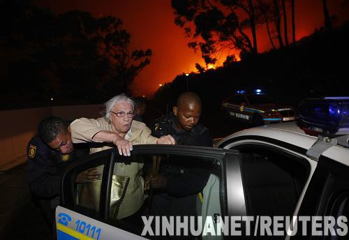 3月18日,在南非開普敦發生森林火災的山區,警察正在疏散當地居民。大火致使當地居民數百人被迫疏散。新華社/路透