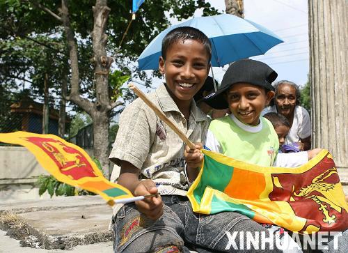 5月19日,在斯里蘭卡首都科倫坡,兩名少年手拿國旗參加慶祝儀式,慶祝歷時26年的斯內戰宣告結束。斯里蘭卡總統拉賈帕克薩當日說,斯政府軍已在打擊反政府武裝泰米爾伊拉姆猛虎解放組織(猛虎組織)的軍事行動中取得最后勝利,斯政府今后將尋求通過政治手段解決長期困擾斯里蘭卡的民族問題。新華社記者劉詠秋攝