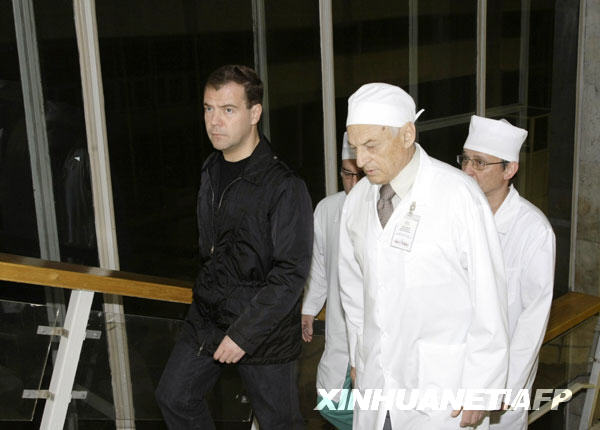 6月23日,在俄羅斯首都莫斯科,俄總統(tǒng)梅德韋杰夫(左一)在醫(yī)生陪同下探望身受重傷的俄羅斯印古什共和國(guó)總統(tǒng)尤努斯·貝克·葉夫庫(kù)羅夫。葉夫庫(kù)羅夫的車(chē)隊(duì)22日上午在印古什共和國(guó)首府納茲蘭市附近遭自殺式汽車(chē)炸彈襲擊,造成多人死傷,他本人也身受重傷。新華社/法新