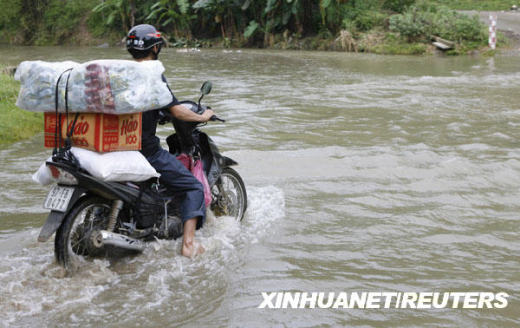 7月6日,在越南北部北件省,一名男子騎摩托車行進在被洪水淹沒的道路上。越南防洪指導委員會當日說,肆虐3天的山洪已造成至少20人死亡,18人失蹤,越南北部多處道路和房屋損毀。新華社/路透