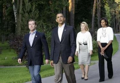 7月6日,俄羅斯總統(tǒng)梅德韋杰夫在莫斯科與到訪的美國總統(tǒng)奧巴馬舉行會談。奧巴馬當日抵達莫斯科進行為期三天的訪問,這是他就任總統(tǒng)以來首次訪問俄羅斯。
