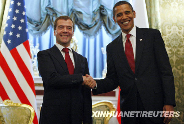 7月6日,俄羅斯總統(tǒng)梅德韋杰夫(左)在莫斯科與到訪的美國總統(tǒng)奧巴馬舉行會談。奧巴馬當(dāng)日抵達(dá)莫斯科進(jìn)行為期三天的訪問,這是他就任總統(tǒng)以來首次訪問俄羅斯。 新華社/路透