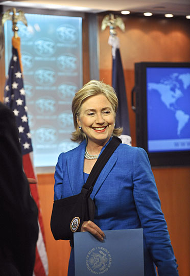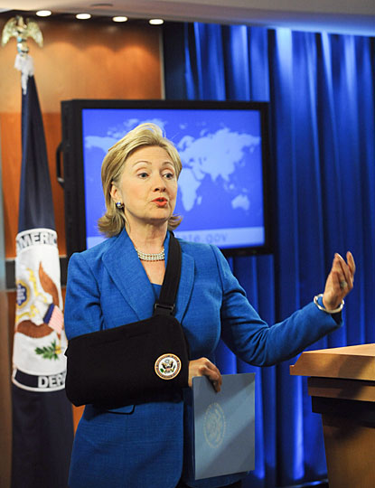 美國當(dāng)?shù)貢r(shí)間7月7日,美國國務(wù)卿希拉里與在軍事政變中遭驅(qū)逐的洪都拉斯總統(tǒng)曼努埃爾·塞拉亞進(jìn)行會(huì)談后,舉行記者招待會(huì)。