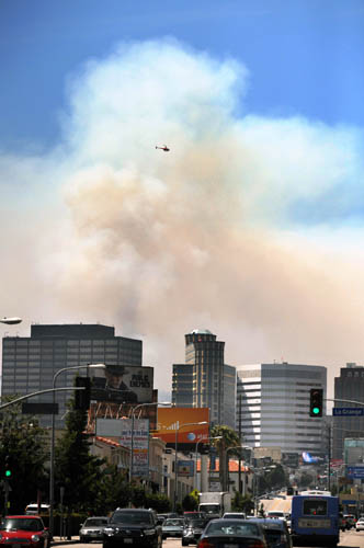 2009年7月8日,美國洛杉磯附件發生山火,市內可見濃煙,一些建筑物里的人群被緊急疏散。