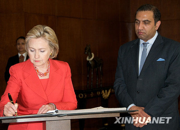 7月18日,在印度孟買的泰姬瑪哈酒店,到訪的美國國務卿希拉里·克林頓(前左)在留言簿上簽名。希拉里于17日晚到達孟買,開始對印度的數天正式訪問。這是希拉里就任美國國務卿以來對印度的首次訪問。新華社發