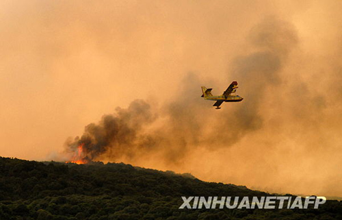 7月23日,在意大利撒丁島,一架飛機在失火的山林滅火。