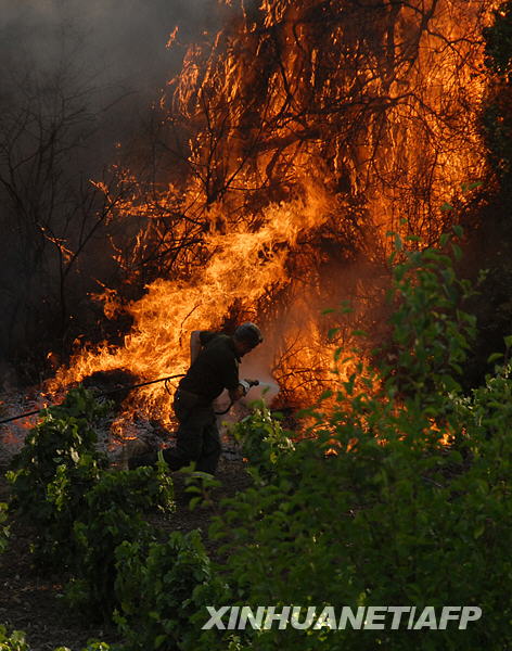 7月23日,在意大利撒丁島,一名消防員在失火的山林滅火。新華社/法新