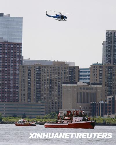 8月8日,在美國紐約曼哈頓島西側(cè)的哈德孫河上,一架警用直升機(jī)和救援船只在飛機(jī)墜毀地點開展救援。新華社/路透
