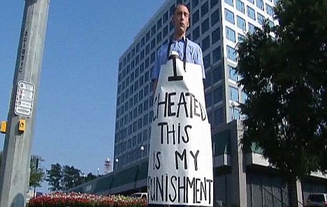 中新網8月28日電 據英國媒體27日報道,一名英國男子因和女人私通,東窗事發后被憤怒的妻子在頸上掛了一個寫著“我欺騙,這是我的懲罰”的告示牌,罰站街示眾。