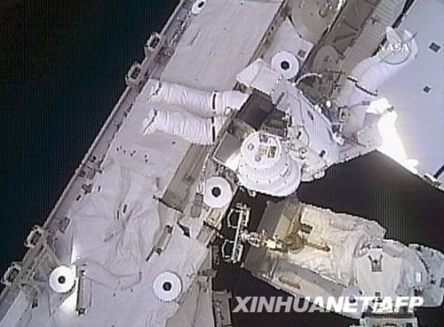 美國國家航空航天局9月1日發(fā)布的電視照片顯示,已與國際空間站成功對接的“發(fā)現(xiàn)”號航天飛機上的宇航員尼克爾·斯托特(右)和丹尼·奧利瓦斯進行第一次太空行走。他們將換下一個如小汽車般大小的氨冷卻水箱并完成一些零件升級與維護。新華社/法新