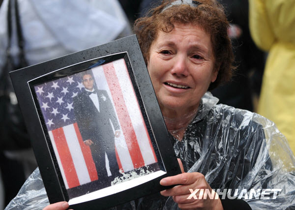9月11日,在美國紐約世貿中心遺址附近, 一名婦女手持遇難親人的照片,參加“9·11”恐怖襲擊事件八周年紀念活動。當日,紐約舉行“9·11”恐怖襲擊事件八周年紀念活動,遇難者的親屬、友人紛紛來到世貿中心舊址緬懷故人。新華社記者谷欣容攝