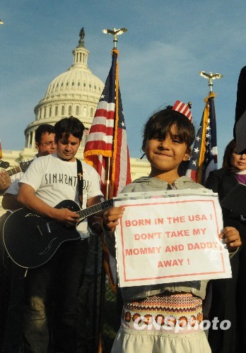 當地時間十月十三日,來自馬薩諸塞州、新罕布什爾州等的二十多個倡導移民改革團體組織數千人在國會山舉行綜合移民改革大型集會。圖為一名小女孩舉著“出生在美國,不要把我的錢和我的爸爸帶走”。 中新社發 吳慶才 攝