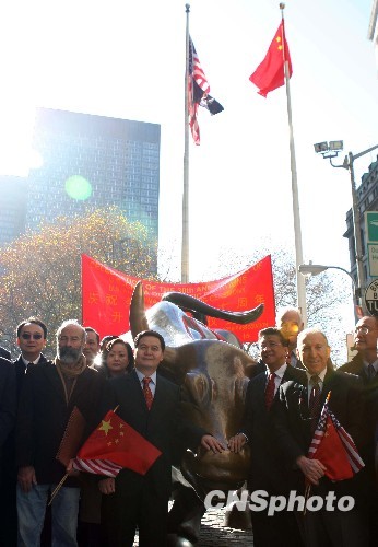 這是紐約歷史上,中國國旗第一次在華爾街銅牛前升起;顒又鬓k方、美中友好協會會長張錦平表示,“對于今天的美中關系來說,這具有很好的象征意義。希望美中關系能如同華爾街銅牛所代表的那樣,永遠蒸蒸日上”。