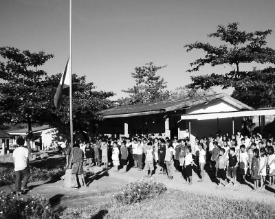 11月26日,位于菲律賓阿布拉省邦貴的一所小學(xué)降半旗,悼念在綁架和屠殺事件中的遇害者。