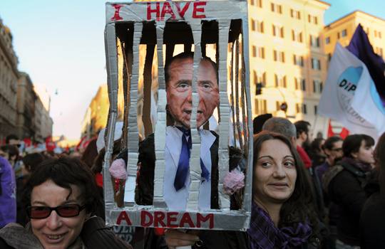 12月5日,意大利首都羅馬爆發(fā)大規(guī)模游行,數(shù)十萬市民參與游行并高舉標(biāo)語要求貝盧斯科尼辭職。游行示威的組織者將這一天稱作“No Berlusconi Day”(沒有貝盧斯科尼的一天)。