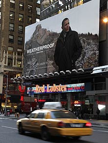 5日,紐約時(shí)代廣場(chǎng)一個(gè)巨幅Weatherproof廣告牌吸引了許多路人駐足觀看。廣告用了一張奧巴馬出訪中國時(shí)在長城上的留影。圖片下面有一行宣傳語“領(lǐng)袖的風(fēng)范”。