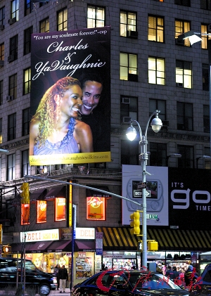 據(jù)美國媒體報道,這5張廣告海報中的3張發(fā)布在紐約鬧市區(qū)——時代廣場附近百老匯建筑的外墻上,另外2張則分別發(fā)布在亞特蘭大市和威爾金斯所住的舊金山市。每張廣告足有3層樓高,海報上威爾金斯和菲利浦斯開懷大笑。在廣告最頂端寫著“你永遠(yuǎn)是我的靈魂伴侶”,并用大字母印著“菲利浦斯和威爾金斯”字樣,廣告最底端印有一個網(wǎng)站鏈接。