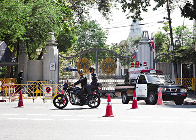 泰國最高法院門前,軍警加強(qiáng)保安工作。