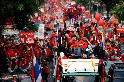 據(jù)香港《大公報(bào)》21日?qǐng)?bào)道,泰國(guó)“紅衫軍”星期六(20日)展開(kāi)新一輪抗?fàn)幮袆?dòng),分乘逾萬(wàn)輛車游行經(jīng)過(guò)曼谷市中心,爭(zhēng)取市民尤其是中產(chǎn)階級(jí)支持,要求總理阿披實(shí)下臺(tái)。紅衫軍領(lǐng)袖揚(yáng)言,他們會(huì)在星期日把行動(dòng)升級(jí),用鮮血繪畫(huà),成為一幅“藝術(shù)創(chuàng)作”,希望鼓舞群眾的士氣。