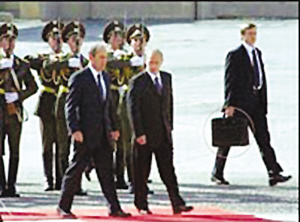美國前總統小布什訪俄時,助手提著“核手提箱”。